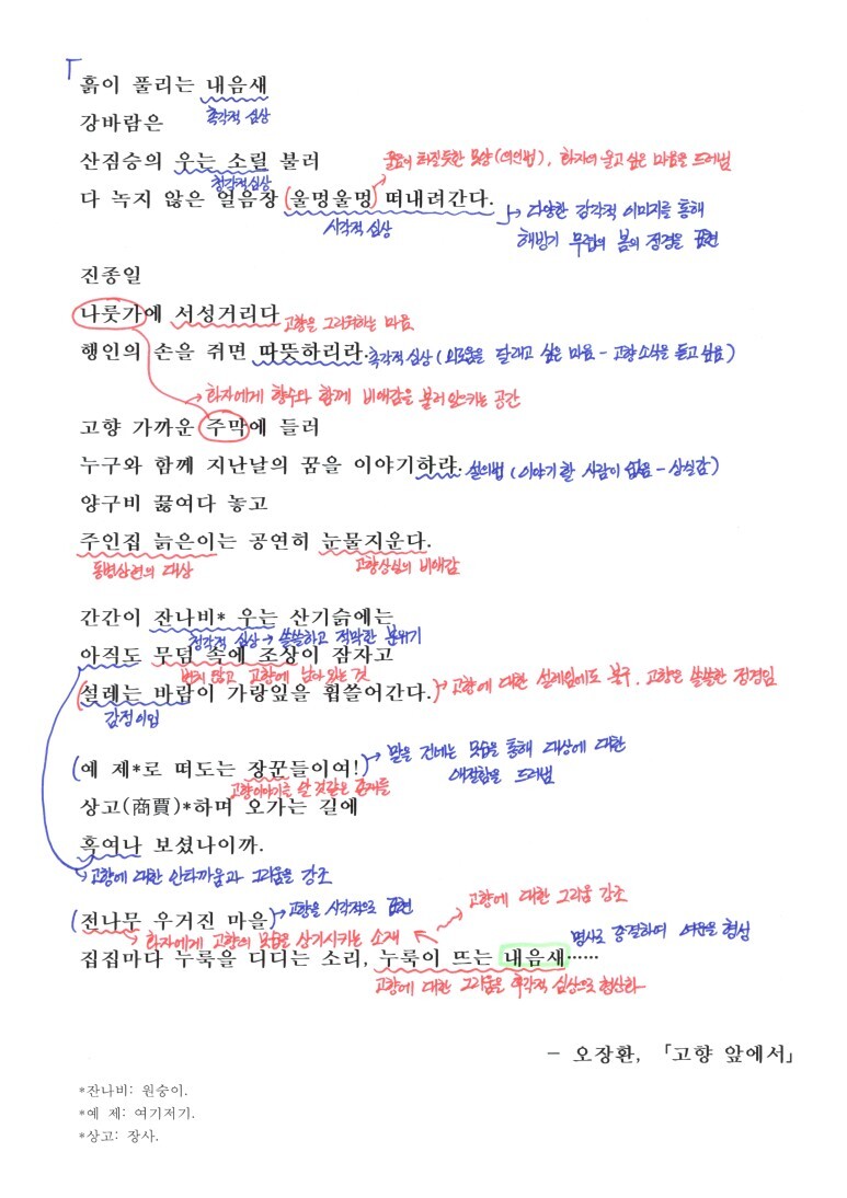 위에서 언급한 것과 같이 이 작품은 화자가 고향 가까이 왔지만 자신이 그리워했던 고향의 모습을 볼 수 없는 현실 앞에서 느끼는 정신적 상실감을 노래하고 있는데요. 그리워하던 고향에 가지 못하고 떠돌이 장꾼들에게서 고향의 정취만이라도 확인하려는 화자의 모습에서 비애와 향수감이 느껴집니다.