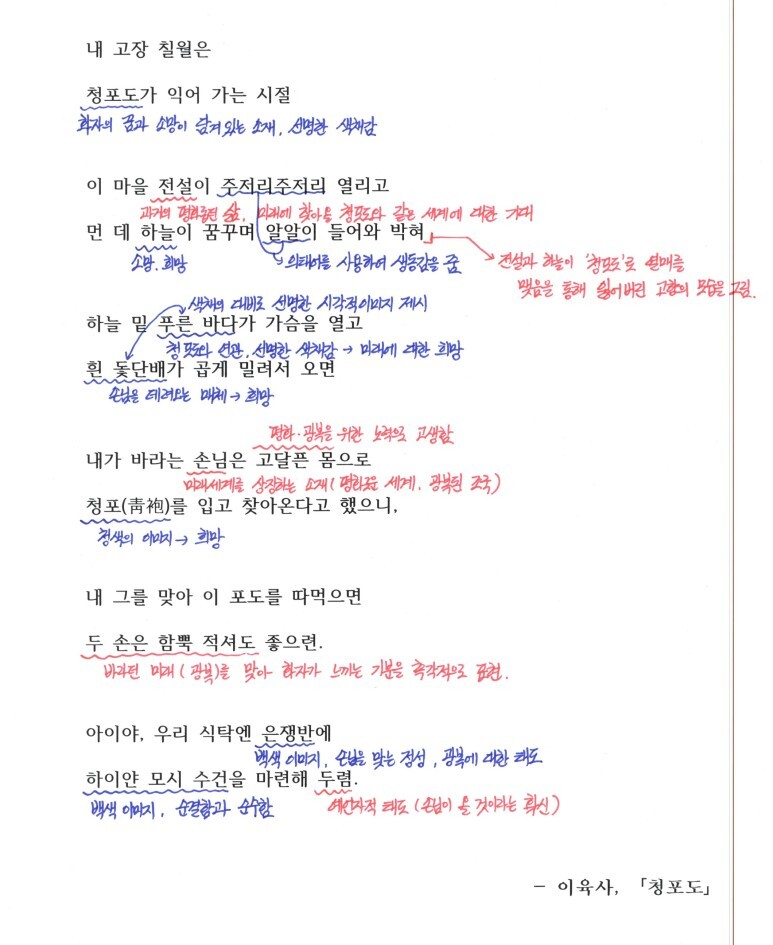 이육사의 '청포도'는 청포도를 통해 풍요롭고 평화로운 미래 세계에 대한 소망을 노래한 작품입니다. '청포도'는 단순한 과일이 아니라 과거의 평화롭던 삶을 상징하며 미래에 찾아올 평화로운 세계에 대한 바램이 담겨 있는 사물입니다. 화자는 이 청포도의 알알이 열리는 것을 통해 잃어버린 고향에 평화가 오는 모습을 선명한 시각적 이미지로 제시합니다.(이는 청포도가 가진 청색의 이미지도 한 몫합니다.)
