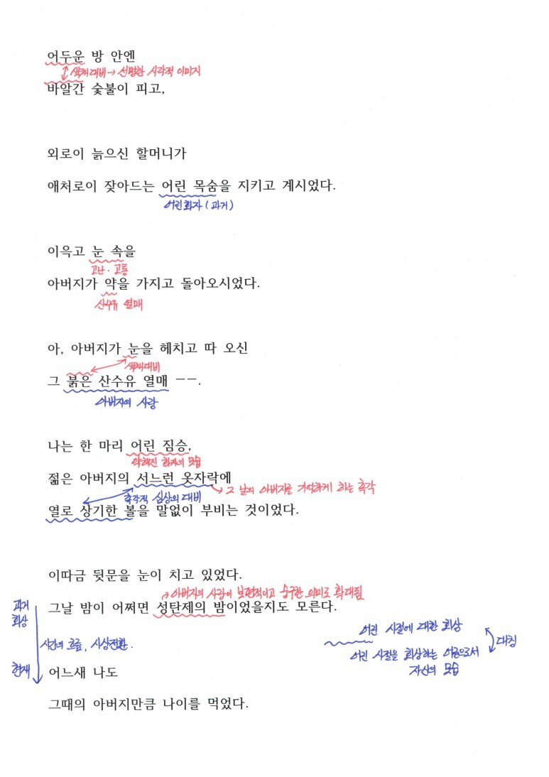 전반부를 보면 어린 시절 화자는 열병을 앓고 있었으며, 아버지가 눈을 뚫고 따 온 붉은 산수유 열매(해열제)와 아버지의 서느널 옷자락을 생각합니다. 여기에서 '붉은 산수유 열매'는 아버지의 사랑을 의미하며 눈이 내리는 추운 날씨의 색감과 대비되는 붉은색의 이미지로 선명하게 제시 됩니다.