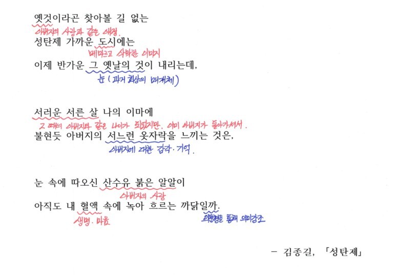 "풍수지탄(風樹之嘆)"은 "부모에게 효도를 다하려고 생각할 때 이미 돌아가셔서 그 뜻을 이룰 수 없어 슬퍼함을 이르는 사자성어입니다. 실제로 나이가 들면 어릴 적 부모님의 사랑이 얼마나 큰 것인지 알게 되고 효도하려 하지만 이미 부모님이 계시지 않는 경우가 있습니다. 오늘 다룰 시 "성탄제"에서도 화자는 인류를 위한 사랑이 넘치는 크리스마스 날, 과거의 아버지의 사랑을 생각하며 아버지를 그리워 합니다.