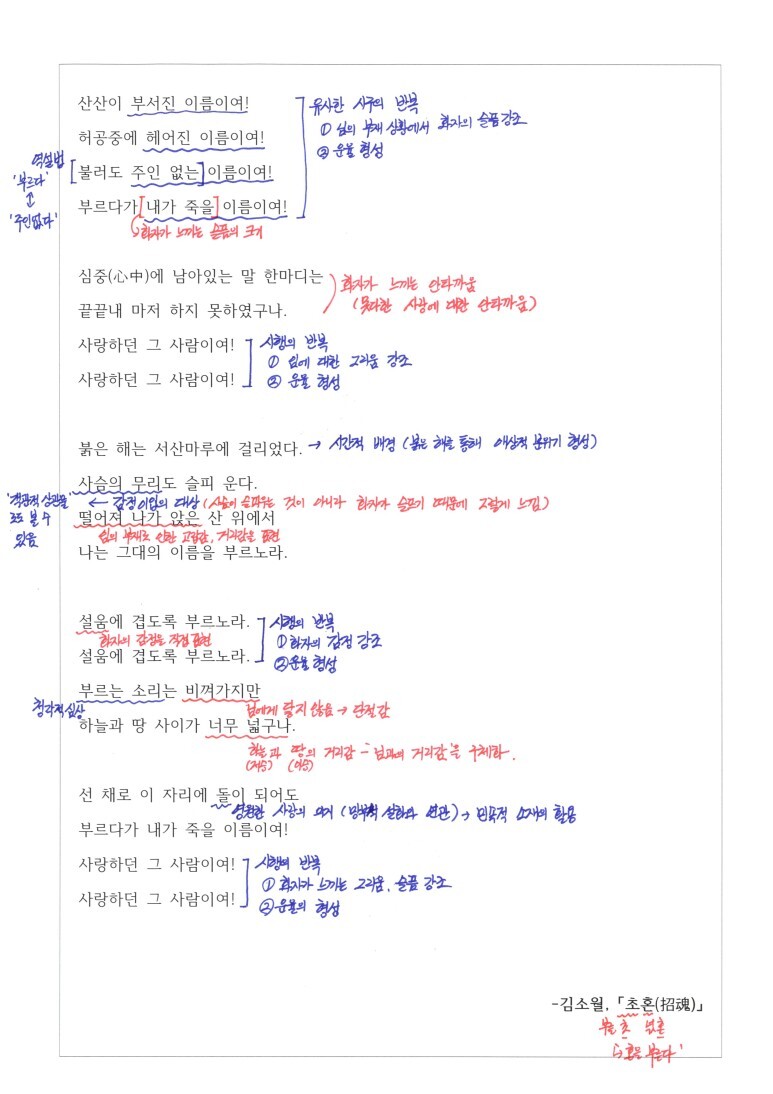 초혼이라는 제목 자체가 부를 초, 넋 혼으로 부재하는 임을 부른다는 뜻을 가지고 있죠.