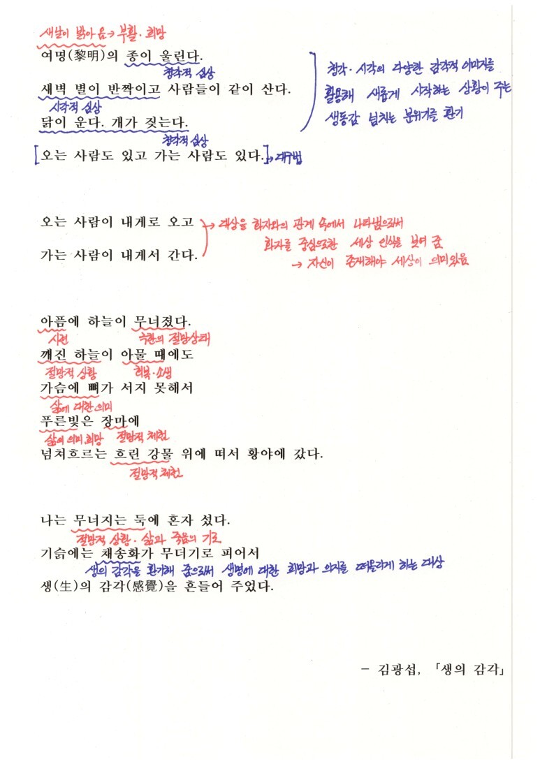 오늘 다룰 시 '생의 감각'에서는 뇌일혈로 쓰러져 사경을 헤매다 건강을 회복한 시인이 투병 체험을 바탕으로 생의 소중함을 일깨우며 그에 대한 의지를 환기하고 있습니다. 사경을 헤매다 회복해 '생에 대한 강렬한 의지'를 다룬 시 생의 감각. 본문을 읽고 해석을 읽어보도록 합시다.