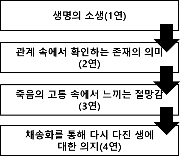 2연에서는 사람들을 통해 소생한 화자의 세상에 대한 인식을 보여줍니다. '오는 사람이 내게로 오고, 가는 사람이 내게서 간다'는 말은 '오는 사람도 가는 사람도 다 나를 통해 알 수 있는 것이다'라는 뜻으로 결국 사람은 자기 자신이 존재해야 세상이 의미있다는 그만큼 자신의 생이 중요하다는 점을 보여줍니다.