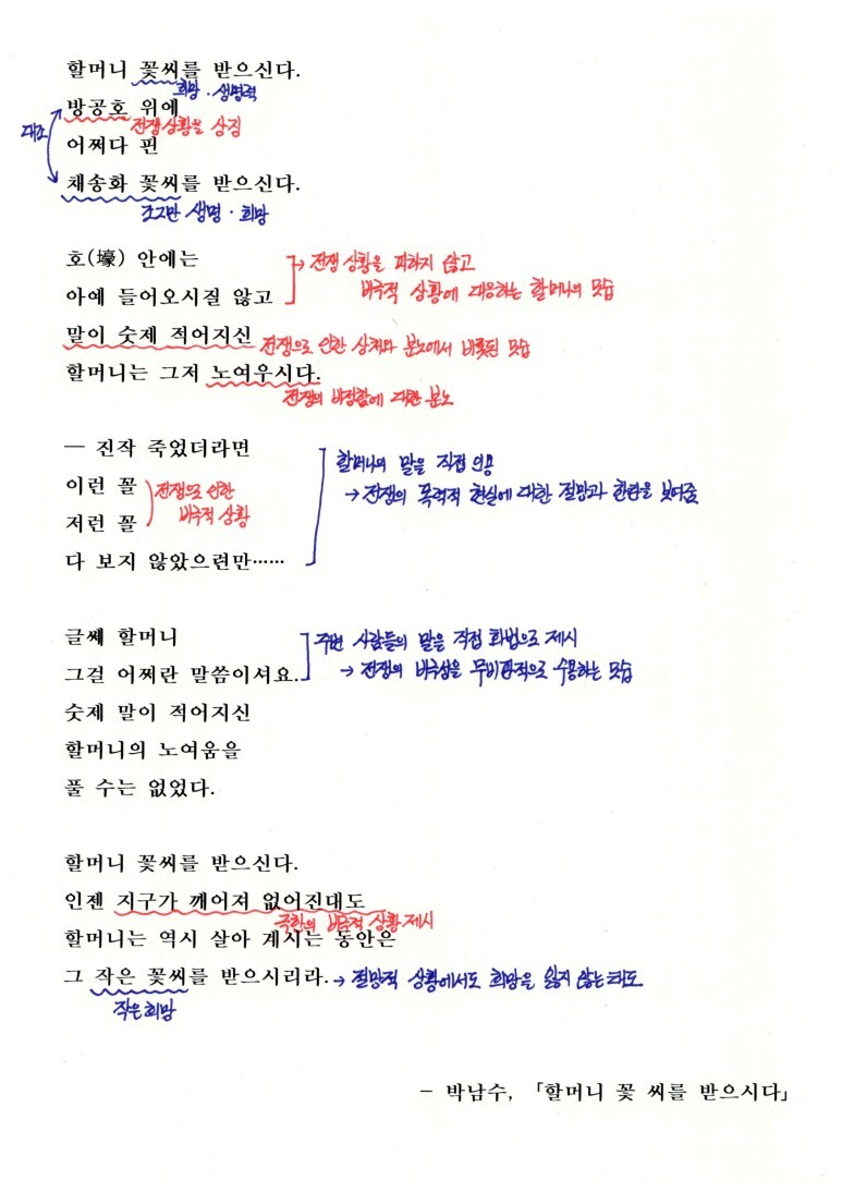 이렇듯 이 시는 꽃씨를 받는 할머니의 행동과 이를 지켜보는 화자의 생각을 통해 '전쟁의 폭력성과 미래에 대한 희망을 드러내고 있습니다.' 이때 1~4연은 현재형 시제를 통해 할머니의 모습을 생생하게 그려내고 있으며, 5연에서는 어떤 상황 속에서도 꽃씨를 받으실 할머니라며 희망을 잃지 않는 모습을 믿는 화자의 생각을 드러내고 있습니다.