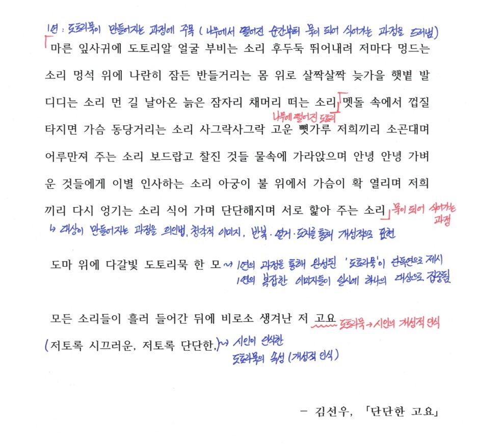 2.시적 대상이 만들어지는 과정에 주목하여 시상을 전개함. 도토리가 떨어지는 순간부터 만들어지는 순간까지 의인법과 청각적 이미지들을 이용해 개성있게 표현하며 도토리묵이 만들어지는 과정에 주목하여 시상을 전개하고 있습니다.