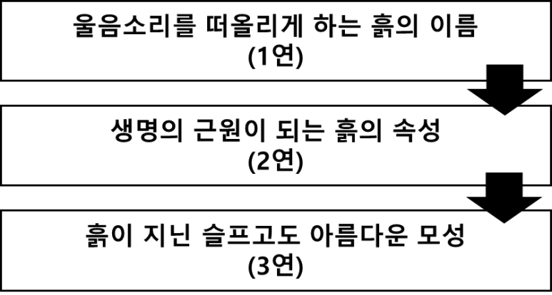 3연에서는 1연의 내용을 심화 반복하며 울음소리처럼 들리는 흙의 이름을 부러워하는 것은 흙이 지닌 모성 때문임을 밝히고 있습니다. 그 모성이란 흙이 자기를 퍼올리는 자기희생을 바탕으로 할 수밖에(농사를 지을 때 땅을 갈아엎는 것과 연관) 슬프기도 하다고 화자는 말하고 있습니다.