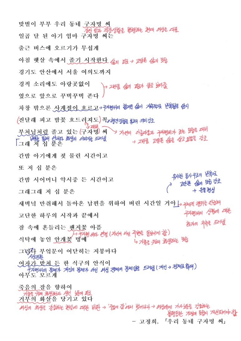 화자는 출근 버스에 오르자마자 졸기 시작하는 구자명 씨의 모습을 관찰하며 가사와 직장 일의 이중 노동에 시달리는 구자명 씨를 연민의 시선으로 바라봄과 동시에 여성의 희생을 강요하는 현실을 비판하고 있습니다. 구자명 씨는 바깥의 상황과 관계없이 계속해서 조는 피곤한 모습을 보여줍니다. 왜 구자명씨가 이리 피곤해하는지에 대해 화자는 유사한 통사 구조를 반복하여 구자명 씨의 고단한 일상을 구체적으로 짐작하며 제시하고 있습니다. 또한, 구자명 씨를 '부처님', ‘팬지꽃’,‘안개꽃’ 등에 비유하여 가족을 위해 희생하는 모습을 보여줍니다. 그리곤, '구자명'이라는 개인을 우리 사회의 여성 전체의 모습으로 확장하며 '여성의 고단한 삶과 여성의 희생을 강요하는 현실에 대한 비판'이라는 주제의식을 드러내고 있습니다.