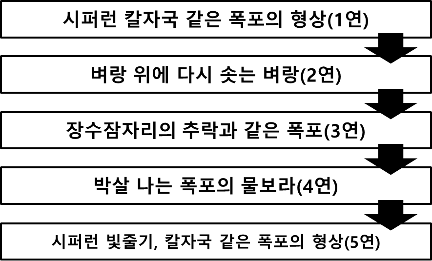 4연에서는 높은 곳에서 떨어져 산산히 부서지는 폭포의 물줄기를 앞에서 말한 장수잠자리의 복안(무수한 눈동자)에 비유해 비극성을 더욱 강조시킵니다. 시인은 추락하는 존재로 삶의 고통을 느끼는 비극을 장수잠자리의 모습을 통해 형상화합니다.