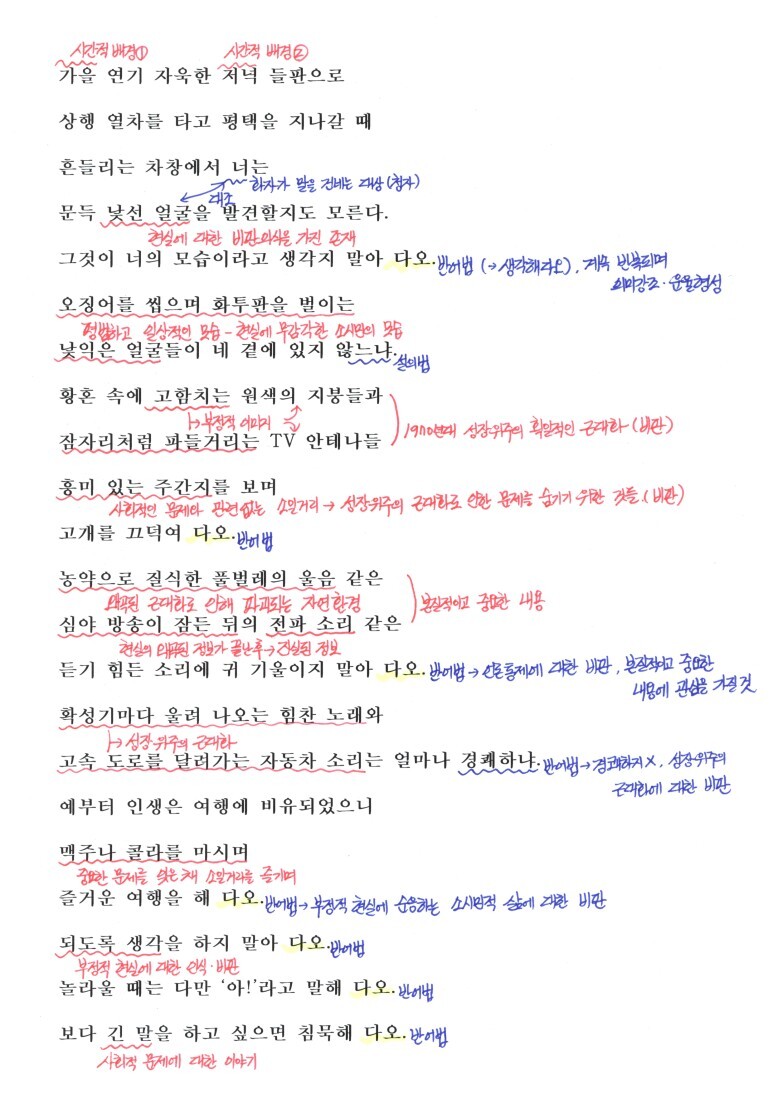 여기서 마지막으로 볼 것은 마지막 구절 '너를 위하여 나를 위하여'입니다. 결국 화자 자신도 '너'처럼 사회 문제에 대해 논하지 못하며 소시민적으로 살고 있다는 성찰로 이 시에서 화자가 전달하는 대상은 청자인 '너'뿐만이아닌 화자 '자신'이기도 합니다.