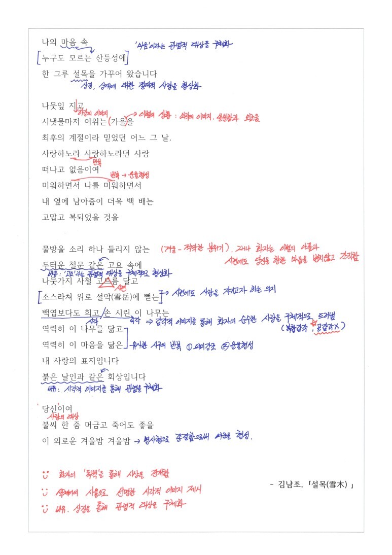 이에 비해 복합심상은 연관없는 두 감각이 나열되어 있는 것을 말합니다. 위 시에서 '백엽보다도 희고(시각) 손 시린(촉각) 나무는'같은 경우는 '백엽보다도 흰 나무'는 혹은 '손 시린 나무는'이라고 표현해도 어색하지 않는 것을 알 수 있습니다. 이렇게 단순히 두 개 이상의 감각이 나열되어있을 때 복합감각이라고 한다는 것을 알면 됩니다:)