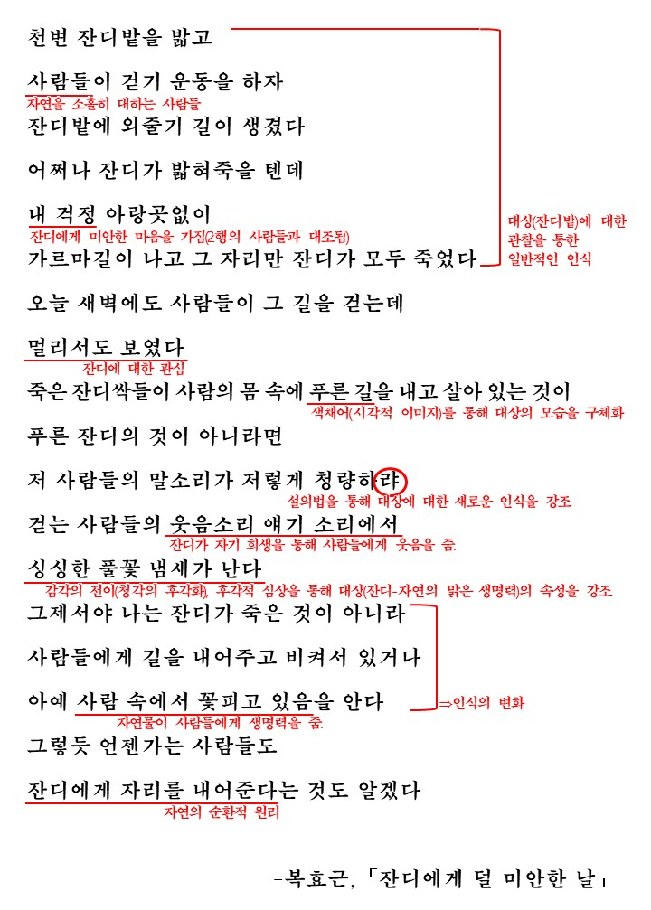이 시는 이렇듯 시인이 대상을 관찰하고 그에 대해 새로운 인식을 가지고 성찰하는 구조를 가지고 있습니다. 대상에 대한 관찰과 그에 대한 생각으로 시상이 전개되고 있는 것이지요. 즉, 관찰-대상에 대한 일반적 인식 - 대상에 대한 새로운 인식(인식의 전환) - 성찰 이런 식으로요.
