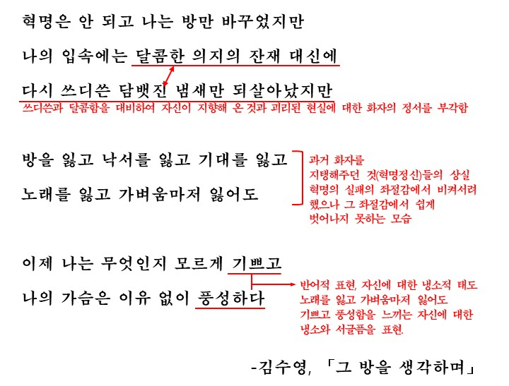 잘못된 현실에 대응하지 못하고 있는 자신을 향한 자조와 냉소. 많은 김수영 시들에서 보이는 특징입니다. 이번에 다룰 시 '그 방을 생각하며'에서도 시인은 혁명에 실패한 후 느끼는 이후의 삶에 대해 노래합니다. 시인이 방을 바꾸는 의미에 주목하며 시를 읽어보도록 합시다.
