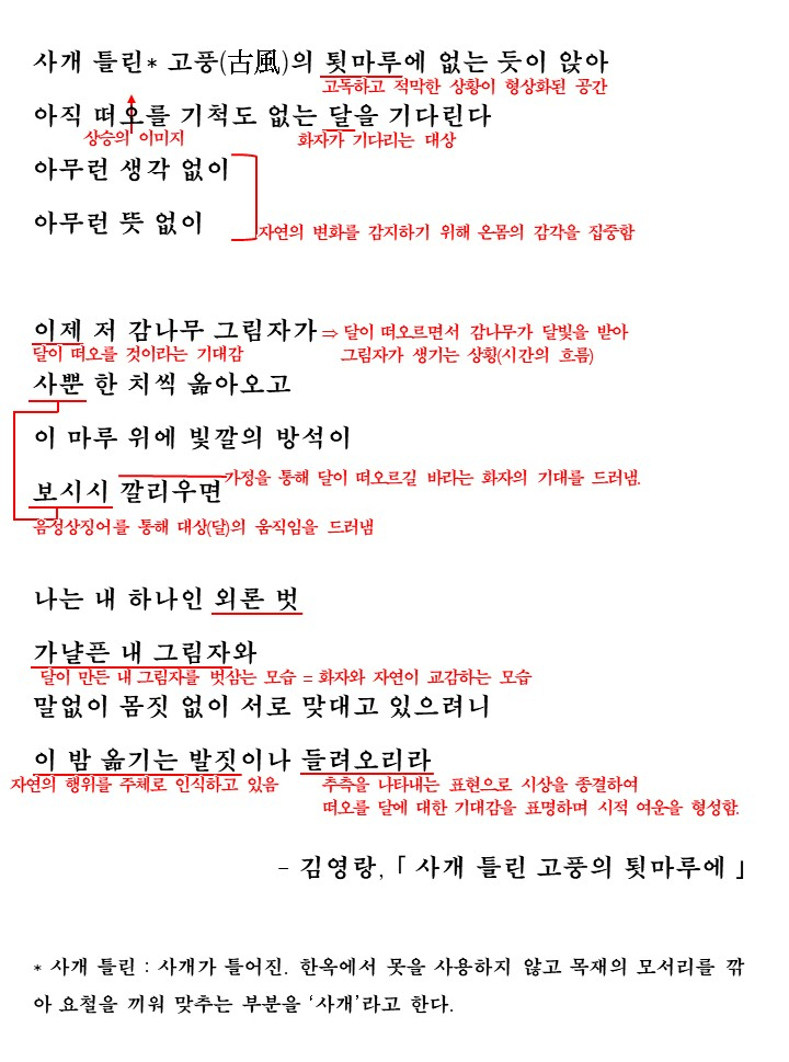 이번 시간에 다룰 '사개 틀린 고풍의 툇마루에'에서 화자는 자연의 순환적 질서에 감응하며 달이 떠오르기를 기다리고 있습니다. 화자가 자연을 기다리는 방식에 초점을 맞추어 시를 읽은 후 해석을 읽어보도록 합시다.