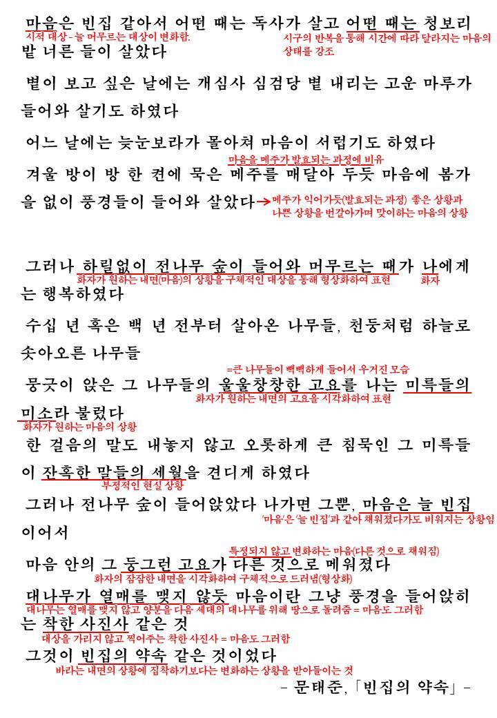 이 시는 시적 화자의 독백을 통해 시상이 전개됩니다. 시적 화자는 처음부터 '마음'을 '빈집 같아서'라고 하며 비유를 통해 화자가 생각하는 마음에 대해 말하고 있습니다. 시의 내용을 요약하면 아래와 같은데요.