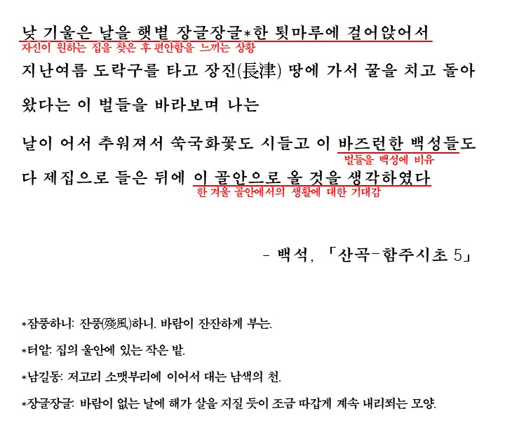 날이 어서 추워져서 쑥국화꽃도 시들고 이 바즈런한 백성들도 다 제집으로 들은 뒤에 이 골안으로 올 것을 생각하였다