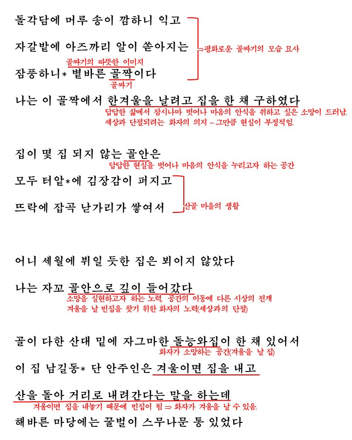 이렇게 해서 '시골의 한적한 집에서 겨울을 보내고 싶은 소망'을 나타낸 이 시는 토속적 시어를 통해서 산골짜기의 향토적인 느낌을 더욱 살리고 있습니다.