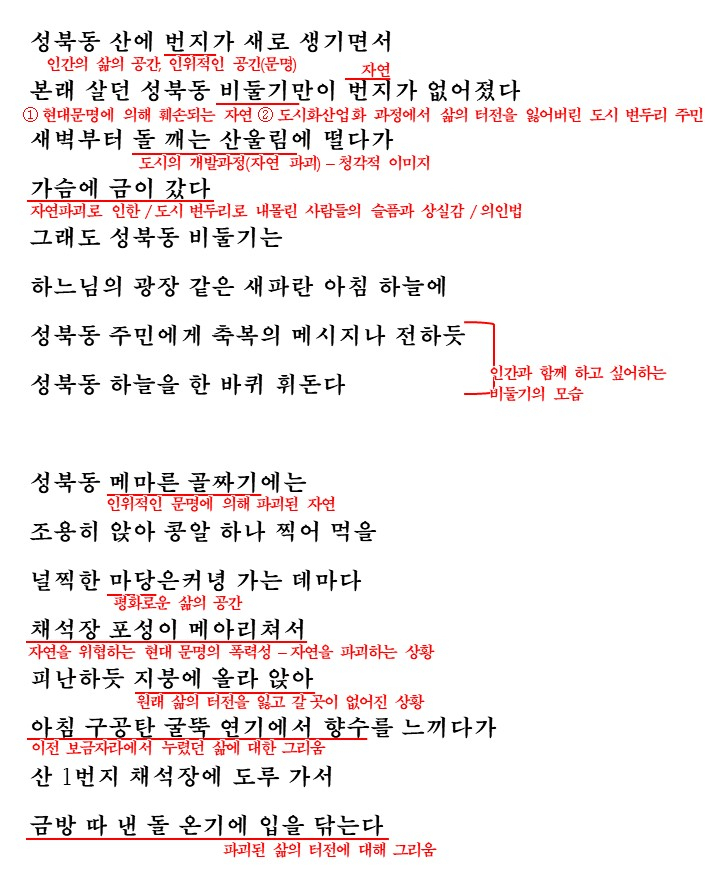 문명이 발달하면서 인위적인 것들에 의해 자연이 파괴되고 황폐화되었습니다. 많은 시인들은 이러한 현대 문명에 대해 비판하는 시를 썼는데요. 이번에 다룰 시 '성북동 비둘기'에서는 사랑과 평화의 상징인 비둘기가 문명과 도시 개발에 의한 자연 파괴로 인해 보금자리를 상실한 채 쫓기는 신세로 전락해 버린 모습을 형상화하여 자연 파괴와 비인간화되어 가는 현대문명에 대해 비판하고 있습니다.