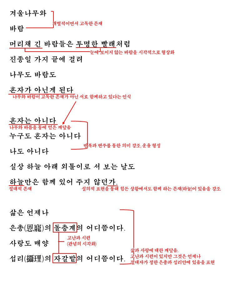 설일은 대상에 대한 관찰로 시가 시작됩니다. 화자는 처음에 겨울나무와 바람을 보는데요. 서로 개별적으로 존재하여 고독해 보이는 두 대상이지만 화자는 계속해서 관찰한 결과 겨울나무와 바람이 혼자가 아니라 함께있는 것이라는 인식을 하게 됩니다. 개별적인 것 같았던 두 존재가 함께라는 인식을 바탕으로 화자는 '누구도 혼자는 아니며 나도 아니다'라는 인식을 가지게 되고 힘든 날이지만 하늘만은 함께 있어주었다며 힘든 삶이지만 이 것도 언제나 은총과 섭리 가운데에 있는 것으로 삶과 사랑에 대한 깨달음을 얻습니다. 그래서 화자는 다짐합니다. 이전까지는 불평, 불만을 했던 것을 삭이고 너그럽고 긍정적으로 삶을 대하자고 말이죠. 그리고 순수한 마음으로 새로운 자세로 흰 눈을 바라보며 새해를 맞이 합니다.