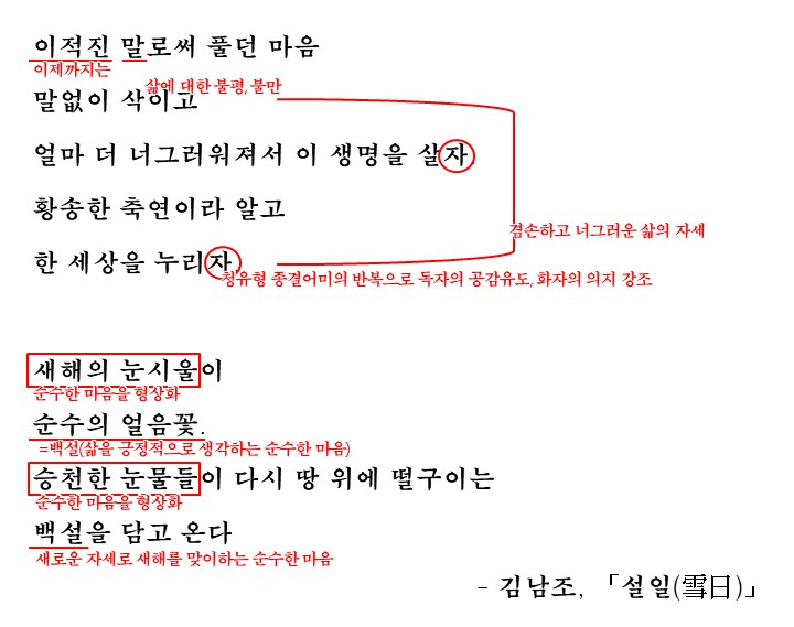 누구나 한번 쯤 삶이 힘들고, 자기혼자라 느낄 때가 있습니다. 이번에 다룰 시 '설일(雪日)'에서 시인는 이러한 인생의 힘든 상황을 긍정적으로 인식하며 새로운 삶이 자세를 가지는 모습을 보여줍니다. 대상의 관찰을 통한 화자의 깨달음과 삶에 대한 다짐이 무엇인지를 생각하며 시를 감상하고 해석을 읽어보도록 합시다.