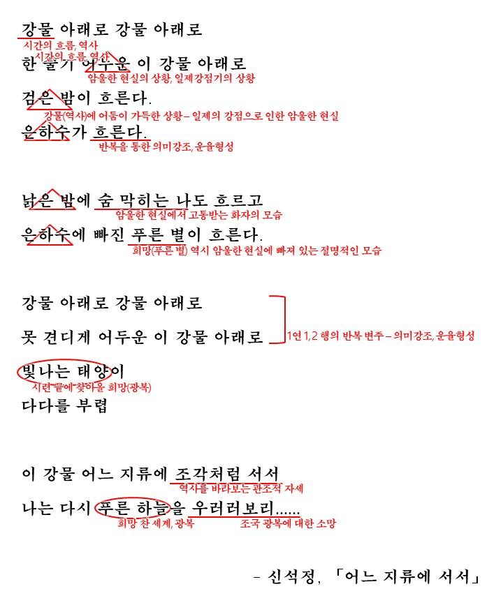 - 반복적인 표현을 통해 의미를 강조하고 운율을 형성합니다. '흐른다'는 시어의 반복, '강물 아래로'라는 시구의 반복을 통해 의미를 강조하고 있는 것이죠.
