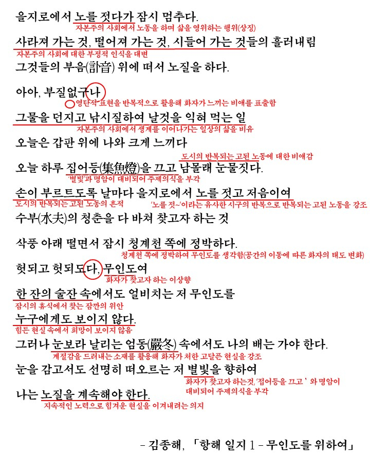 도시 노동자의 힘겨운 삶. 매일 반복되는 노동과 삭막함 속에서의 힘겨움은 많은 시에서 다뤄졌습니다. 이번에 다룰 '항해 일지1 - 무인도를 위하여'는 「항해 일지」 연작시 중 첫 번째 작품으로 인생이라는 삶의 여정을 '항해'로 상징하여 나타내고 있습니다. 각각의 지명과 행위가 어떤 의미인지를 생각하며 시를 감상하고 해석을 읽어보도록 합시다.