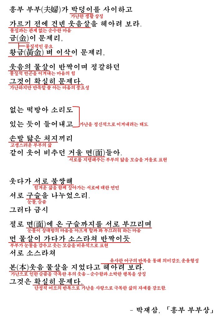 시의 처음에서 박을 가르기전 마주하고 웃고 있는 흥부 부부의 모습이 제시됩니다. 그들은 박을 가르기 전 금과 황금과는 관계없는 웃음을 지으며 서로를 바라봅니다. 2연에서 없어도 있는 듯 고생했지만 함께 웃고 지탱해주는 부부의 모습이 표현되며 3연에서는 서로를 배려하며 가난으로 인한 설움을 극복하고 사랑으로 이를 극복하는 모습을 보여줍니다.
