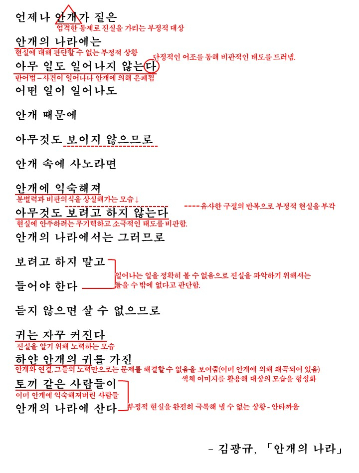 과거 1970년대에는 엄격한 통제로 인해 진실이 숨겨지며 사람들이 옳고 그름을 판단하지 못하고 현실에 순응하며 살아갔습니다. 이번에 다룰 시 '안개의 나라'에서는 그러한 통제로 인한 진실의 왜곡을 '안개'이라는 상징을 이용해 나타내며 이를 비판하고 부조리한 현실을 이겨 내기 위한 노력을 촉구하고 있습니다.