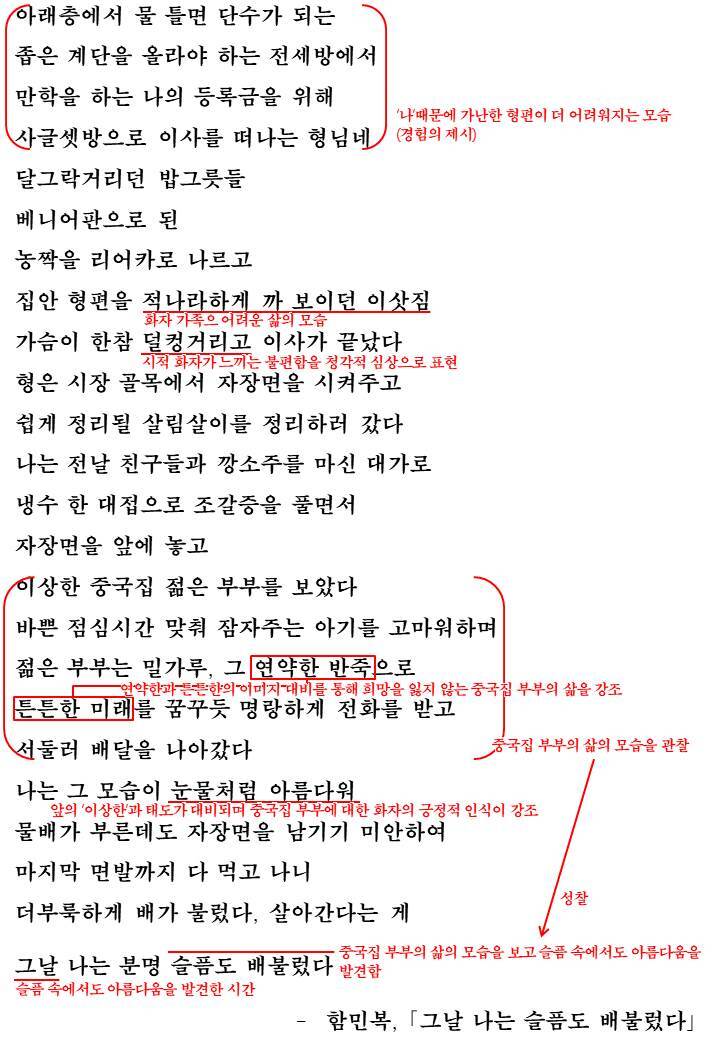 사람이 다른 동물과 다른 점은 아무리 힘든 상황 속에서라도 자신의 삶을 성찰할 수 있다는 점이 아닌가 싶습니다. 오늘 다룰 시 '그날 나는 슬픔도 배불렀다'에서는 이렇게 자신의 삶에 대해 성찰하는 화자의 모습이 드러납니다. 화자는 어떠한 상황에서 어떤 대상을 보고 자신의 삶을 성찰하는지에 중점을 두고 감상한 후 해석을 읽어보도록 합시다.