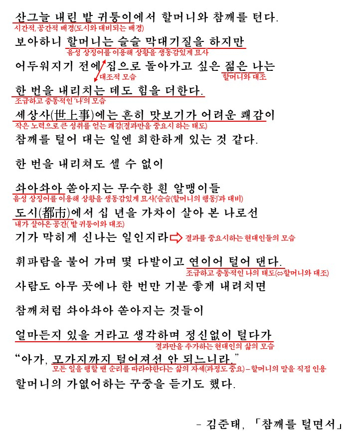 위 말들은 일반적으로 사람들이 들었을 때 대부분 인정할만한 것들이지만 사람들은 알고서도 어느새 잊어버린 채 이러한 것들을 실천하지 못하는 경우가 많습니다. 이번에 다룰 시 '참깨를 털면서'에서는 성급하고 결과만을 추구하는 '젊은 나'가 '할머니'와 참깨를 털던 경험을 통해 이러한 사람들에게 무언가를 전달합니다. 참깨를 털던 경험을 통해 시인이 전달하고자 하는 것이 무엇인지에 중점을 두고 시를 감상한 후 해석을 참고하도록 합시다.