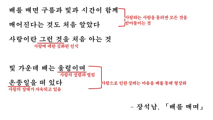오늘 다룰 시 장석남의 '배를 매며'에서는 사랑이 시작되는 과정을 배를 밧줄에 매는 일에 빗대어 사랑과 인연의 의미에 대해 이야기 합니다. 시인이 생각하는 사랑이란 어떤 것인지를 중점으로 시를 감상하고 해석을 읽어보도록 합시다.