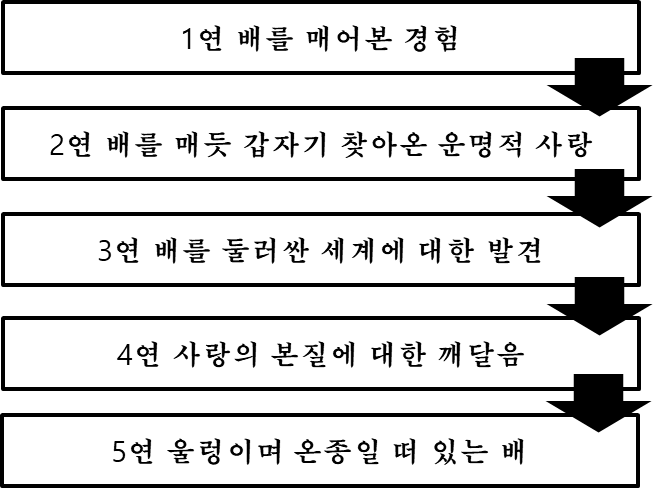 시는 배를 매어본 경험에서 시작합니다. 시인은 배를 매어본 경험을 통해 사랑에 대해 생각하는 데요. 이렇듯 이 시는 사랑이라는 추상적인 관점에 대한 생각을 배를 매는 구체적인 경험으로 형상화 하여 드러내고 있습니다. 즉, 표면적으로는 배를 밧줄로 매는 일을 노래하고 있지만, 이면적으로는 사랑의 본질을 사색하고 있는 것이지요. 사랑이란 배를 갑자기 날아든 밧줄을 잡아 배를 매는 것처럼 예기치 못한 순간에 저항할 수 없이 시작되며, 배를 맬 때 배를 둘러싼 구름과 빛과 시간이 함께 매어지듯이 사랑 또한 사랑하는 이를 둘러싼 세계까지 함께 받아들이는 일이라고 시인은 배를 매는 행위와 연관하여 말하고 있는 것이죠.