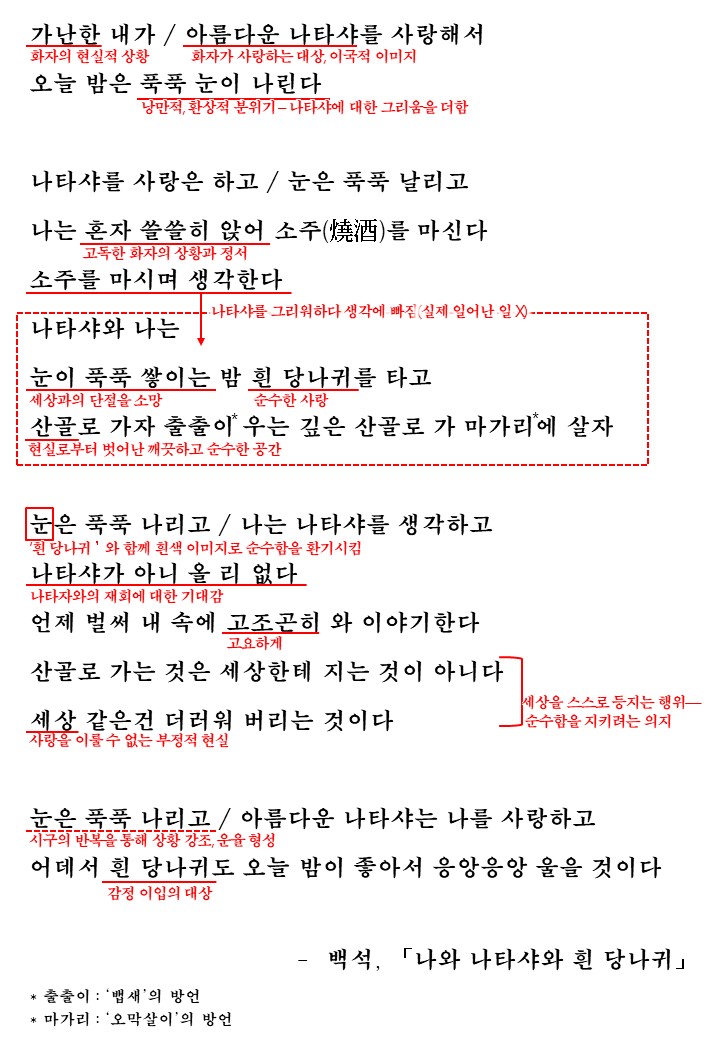 이렇게 이 시는 자연물을 통해 화자의 정서를 드러내며 이국적 이미지의 시어(나타샤)를 통해 사랑의 환상을 형상화하고 있습니다.