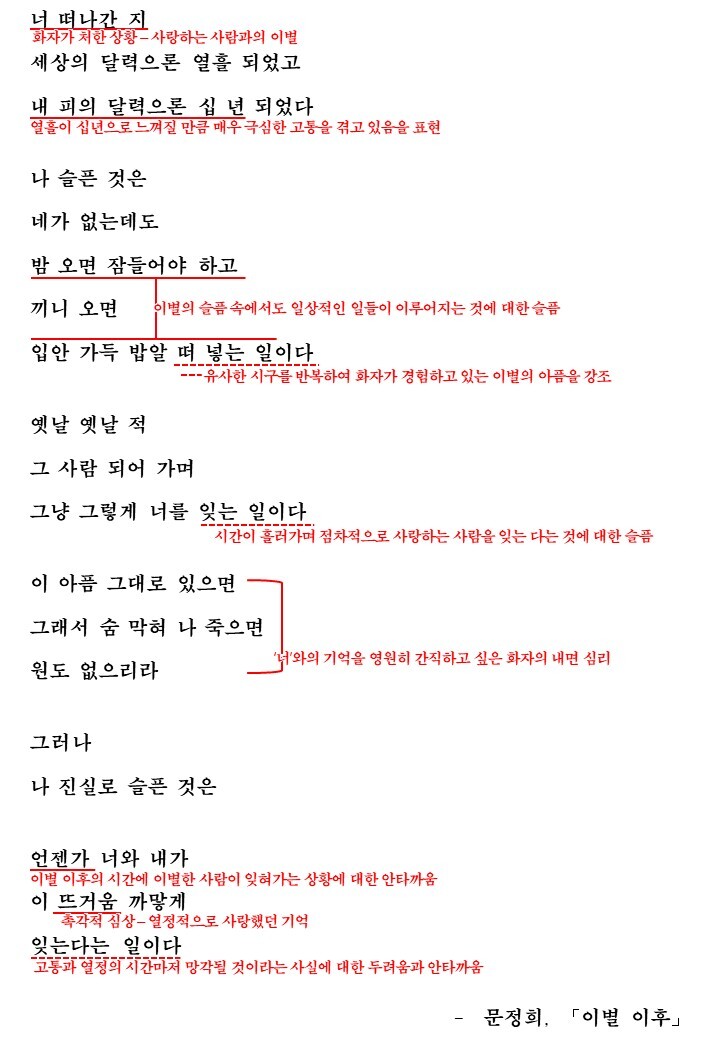 이별이 주는 슬픔은 이루 말할 수 없는 아픔입니다. 이는 누구나 공감할만한 것으로 소중한 사람과의 이별일 수록 그렇습니다. 이번 시간에 다룰 시 '이별 이후'에서는 사랑하는 사람과의 이별 후의 마음을 드러내는 데요. 화자는 이별 후의 어떤 점에 가장 큰 슬픔을 느끼는지를 생각하며 시를 감상하고 해석을 읽어보도록 합시다.