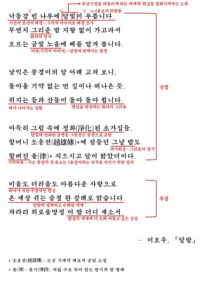 앞서 말한 것과 같이 선경후정의 방식을 사용했습니다. 선경 후정은 먼저 풍경(외부의 모습)을 보여준 후 그에 따른 화자의 정서를 표현하는 방식인데요. '달밤'에서도 1~3수 까지는 현재 달밤의 모습, 과거 달밤의 모습을 보여 준 후 4수에서 화자의 정서를 표현하며 마무리하고 있습니다.