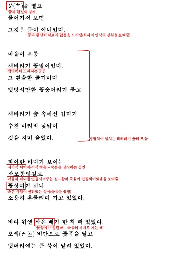 이렇게 해서 화자는 '문'을 통해 꿈속 세계로 들어가 그곳에서 삶과 죽음이 연결된 것임을 확인하고, 그것이 꿈속의 이야기만이 아니라 '문'밖 현실의 이야기이기도 하다는 생각을 표현합니다.