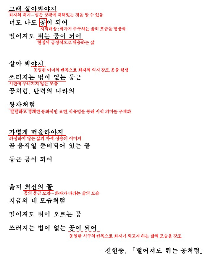 이 시는 이러한 삶의 자세를 눈으로 볼 수 있는 '공'이라는 시적 대상에 비유하여 표현하고 있습니다. 이는 눈에 보이지않는 '삶의 자세'라는 관념적인 내용을 눈에 보이는 '공'으로 형상화한 것으로 볼 수 있습니다. 또한 이런 내용을 유사한 구절의 반복과 변주로 강조하며 리듬감을 조성해 더욱 효과적으로 전달하고 있는 것이죠.