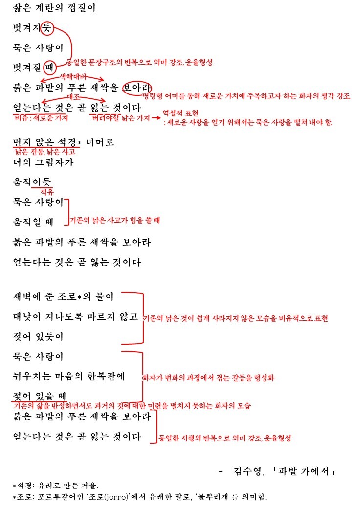이렇게 해서 묵은 사랑(기존의 관습, 사고)에서 벗어나 새로운 사랑(새로운 가치)를 추구하고자 하는 의지를 드러내고 있습니다. 이를 동일한 문장 구조를 반복하는 방식, 비유와 역설의 표현 방식, 대조의 방식을 활용하여 효과적으로 드러내고 있는 것이죠.