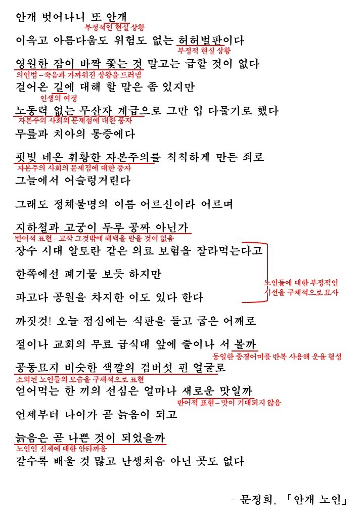 시를 읽어보면 현대 사회에서 외면당하는 노인들의 불우한 모습을 담담하게 표현하고 있음을 알 수 있습니다. 노년의 삶을 허허벌판이라고 표현하며 지나온 인생에 대해 할 말은 있지만 지금은 노동력도 없는 무산층이 되어버린 쓸모없는 처지여서 말도 하지 못하는 노인들의 신세를 구체적으로 묘사하고 있습니다. 지하철과 고궁을 무료로 이용 가능하지만, 한쪽에서는 의료 보험을 잘라먹는다며 폐기물처럼 바라보는 시선을 감당해야하는 노인들의 삶이 드러나는 것이죠. 시의 마지막에서 언제부터 늙음이 나쁨이 되었을까 하며 이러한 세태에 대해 한탄이 드러납니다.