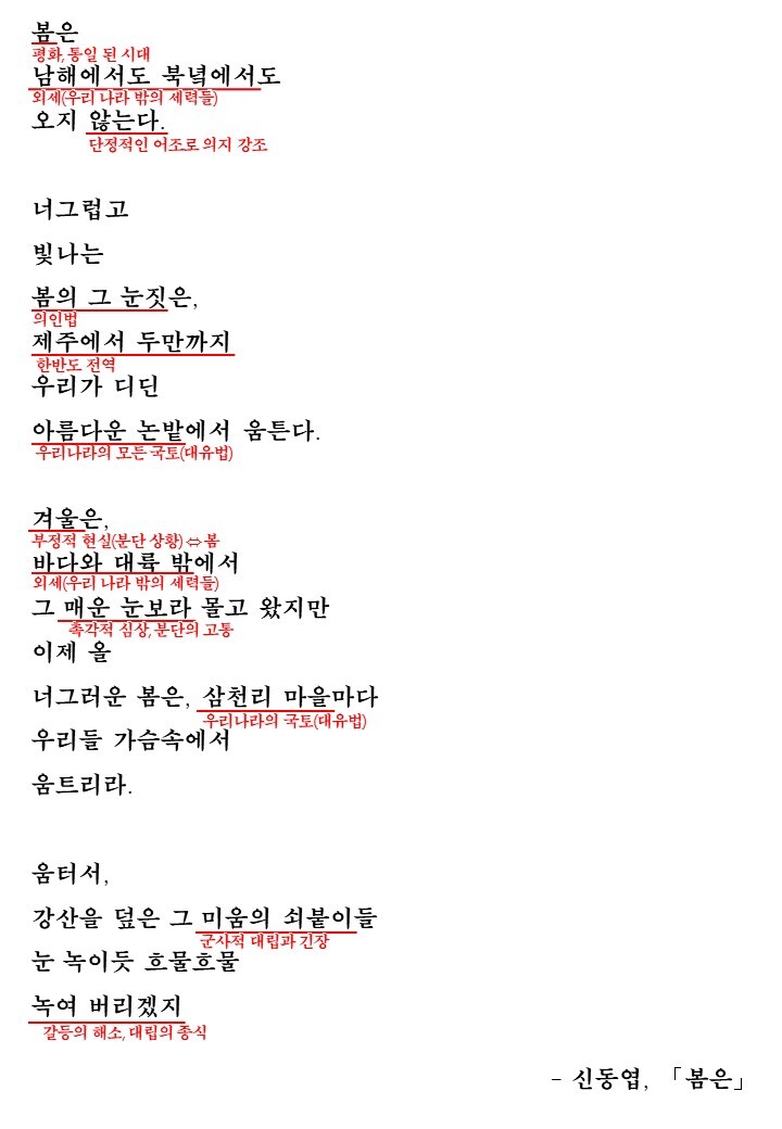 시간이 지나 요즘의 학생들에게는 익숙하지 않을 수 있겠지만 2000년대 이전까지는 통일에 대한 사회적 열망이 상당히 강했습니다. 위의 가사와 같은 노래도 상당히 많이 불렸죠. 그만큼 통일에 대한 염원이 강했는데요. 오늘 다룰 시 신동업의 '봄은'에서는 이러한 통일에 대한 염원을 노래합니다.