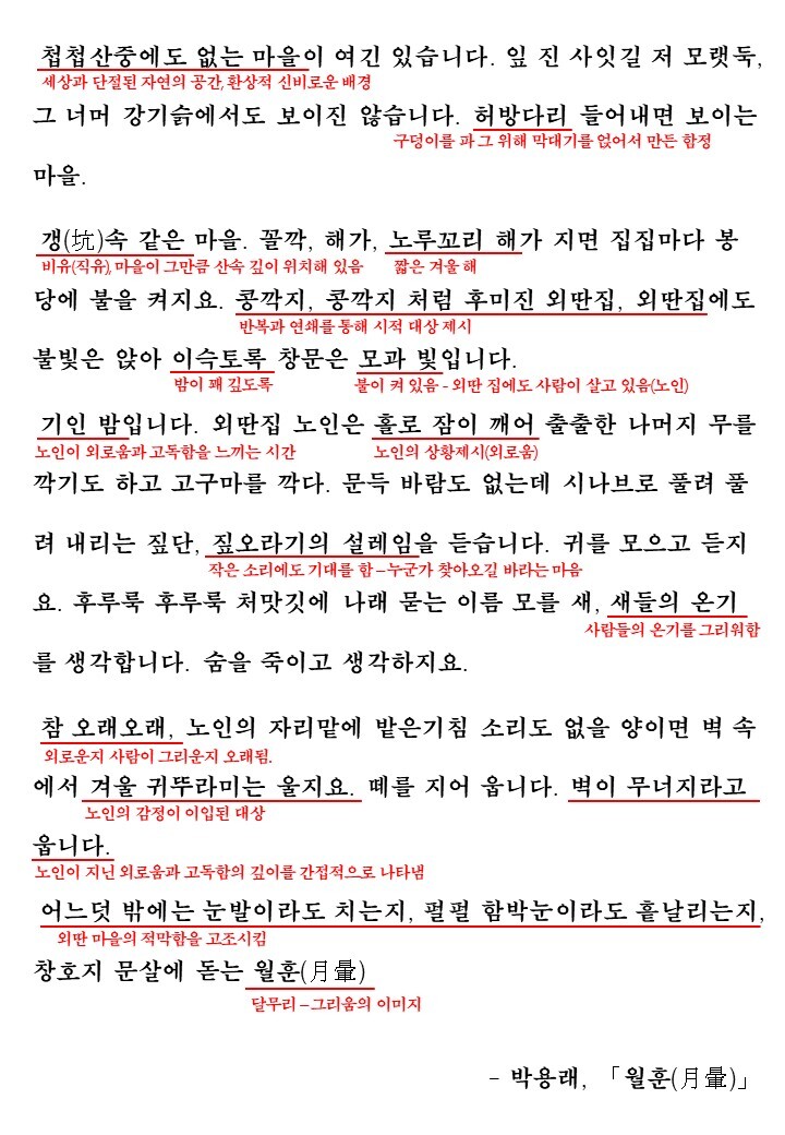 오늘 다룰 시 '월훈(月暈)'에서는 이처럼 산속 외딴 집에 홀로 사는 노인의 외로움을 그리고 있는데요. 노인이 느끼는 정서에 집중하여 시를 읽어보도록 합시다:)