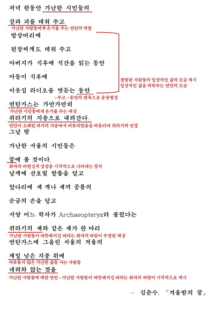 이렇게 연탄가스와 쥐라기를 연결시킨 초현실적 상상을 꿈을 통해 형상화함으로서 화자는 가난한 사람들에 대한 연민을 드러내는 데요. 이제 전문해석을 통해 학습을 마무리해보도록 합시다.