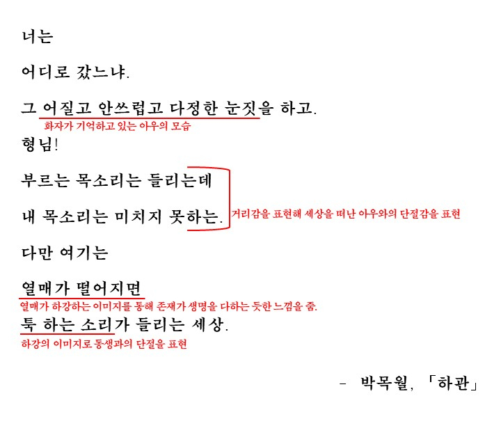 시를 읽다보면 죽음을 맞이한 대상이 누구인지 알 수 있습니다. 바로 화자의 친 동생이지요. 동생이 죽었고 이에 대한 슬픔의 정서를 노래한 시가 바로 '하관'이라고 할 수 있습니다. 내용자체는 간단합니다. 동생이 죽은 후 관을 내렸고 나는 기도하며 슬퍼합니다. 그후 꿈속에서 동생을 보고 동생은 나를 부릅니다. 그리고 나도 전신으로 동생을 부릅니다. 그러나 화자가 전신으로 부른 그 소리는 동생에게 닿지 않습니다. 화자는 인식합니다. 이 소리가 닿지 않을 만큼 이승과 저승의 거리는 멀다고 날 부르는 동생의 소리는 들리지만 내(화자)의 목소리는 미치지 못한다고 말입니다. 그렇게 시는 마무리 됩니다.