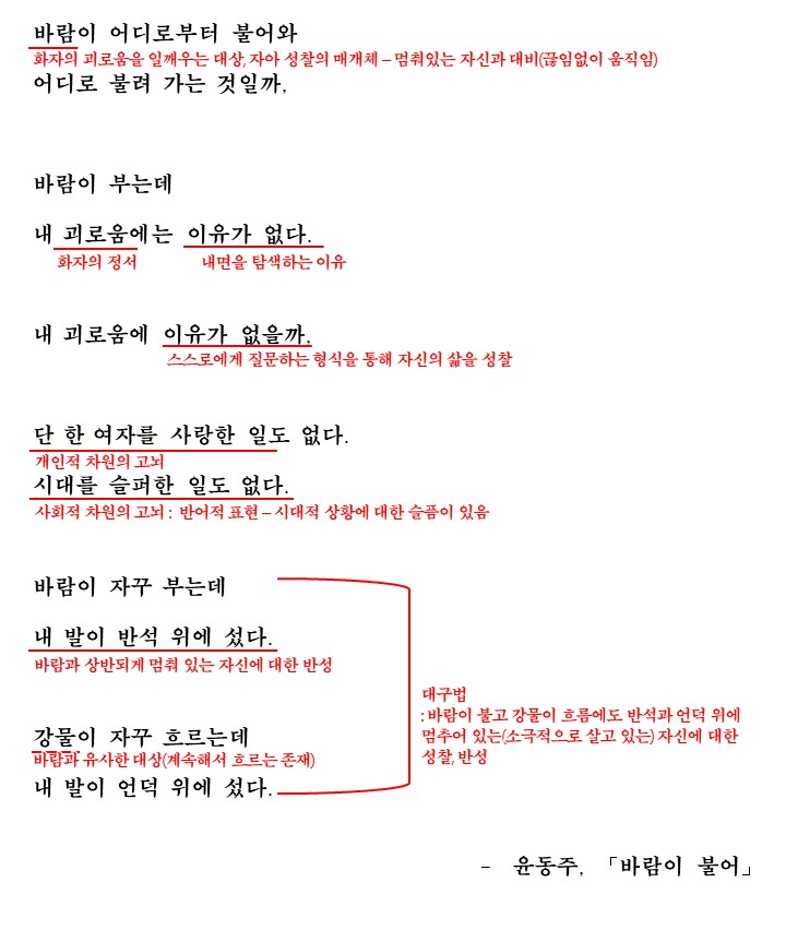 한국인이 가장 사랑하는 시인 윤동주. 그의 시의 특징이라면 '자기성찰과 부끄러움'의 정서라고 할 수 있습니다. 이번에 다룰 시 '바람이 불어'에서도 시인은 '자기성찰과 부끄러움'의 정서를 보여주는데요. '바람'과 '시적화자'의 관계를 중심으로 시를 감상한 후 해석을 통해 학습해보도록 합시다.