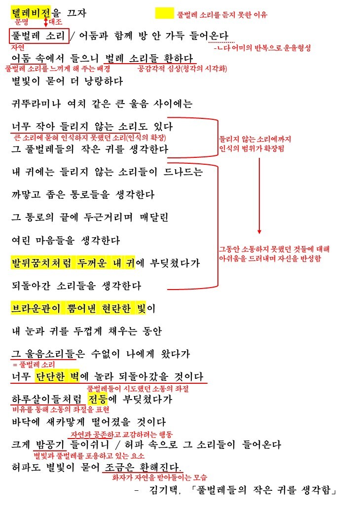 현대사회에 살다보면 자연의 소리를 듣고 싶어하면서도 수많은 문명의 소리 떄문에 듣지 못하는 경우가 많습니다. 이번에 다룰 시 '풀벌레들의 작은 귀를 생각함'에서는 텔레비전으로 대표되는 문명을 끄고 풀벌레로 대표되는 자연에 소리를 듣는 행위를 통해 자연과의 공생에 대한 소망을 드러냅니다. 문명과 자연을 나타내는 시어들이 무엇인지를 생각하며 시를 감상한 후 해석을 통해 학습해보도록 합시다.
