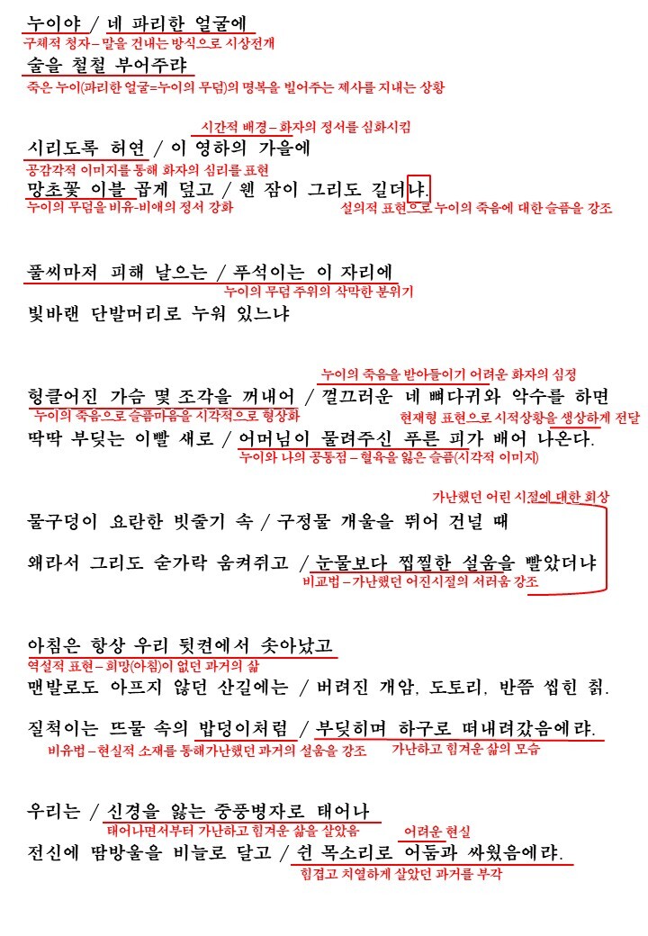 시의 처음에서 화자는 누이를 부르며 누이의 무덤에 술을 붓고 있습니다. 그러면서 누이에게 말을 건내는 방식으로 시상이 전개됩니다. 이후 죽은 누이에 대한 그리움, 죽음을 받아들이기 힘든 심정, 안타까움을 드러낸 후에 누이와의 과거를 생각합니다. 둘은 너무나 가난했고 너무나 힘겨운 희망이 없는 삶을 살았으며 태생부터 가난해서 늘 힘겹고 치열하게 살아갔습니다. 과거의 회상이 끝난 후 슬픈 화자는 누이의 무덤에 술을 뿌리며 죽은 누이의 영혼과 정서적으로 교감합니다. 힘든 과거를 함께한 대상과만이 할 수 있는 정서의 교감을 말입니다.