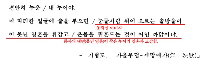 이렇게 해서 이 시는 '죽은 누이에 대한 추모와 그리움, 영혼의 교감'을 나타내고 있습니다. 그리고 이러한 주제를 효과적으로 나타내기 위해 정사를 다양한 감각적 심상을 이용해 시각화 구체화하였고, 비유와 역설적를 통해 과거의 어려웠던 삶의 모습을 보여주고 있습니다.