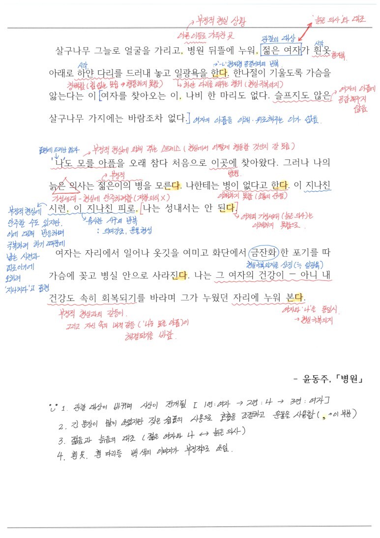 '병원'은 일반적으로 알려진 윤동주의 시와는 다른 느낌입니다. 일반적인 윤동주의 시는 시인 자신의 이야기를 하며 자아를 성찰한다면 이 '병원'은 '젊은여자'를 관찰하며 이에 대해 서술하는 '이야기 시'에 가까운 느낌이기에 난해 할 수 있습니다. 그러나, 이 병원 역시 '현실에 대응하지 못하는 젊은 이의 답답함'을 다룬 면에서 일반적인 윤동주의 시와 같은 의미를 드러낸다고 할 수 있습니다. 그럼 내용 설명을 참고해 봅시다.