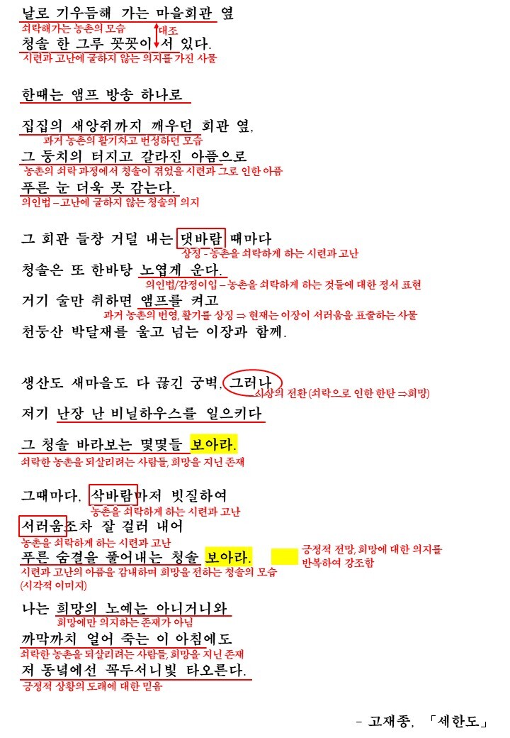 이렇게 이시는 쇠락해가는 농촌에서 버티며 꿋꿋하게 서있는 푸른 소나무의 모습을 통해 '쇠락해 가는 농촌의 현실을 극복하고자 하는 의지와 희망'을 나타내고 있습니다. 이러한 주제를 푸른 소나무의 모습을 묘사함과 동시에 명령형 종결어미의 반복을 통해 의지를 강조하고 있는 것이죠.