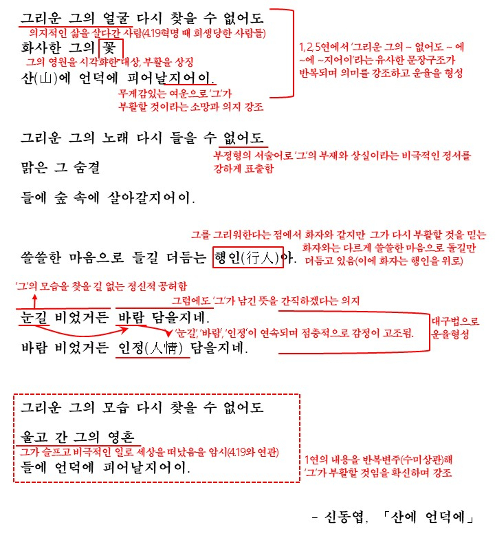 이렇게 이 시는 '그리운 이가 추구하던 소망의 실현에 대한 염원'을 노래하고 있습니다. 그리고 이를 효과적으로 표현하기 위해 유사한 구조의 반복 및 대구법으로 운율을 형성하고 의미를 강조하고있습니다.