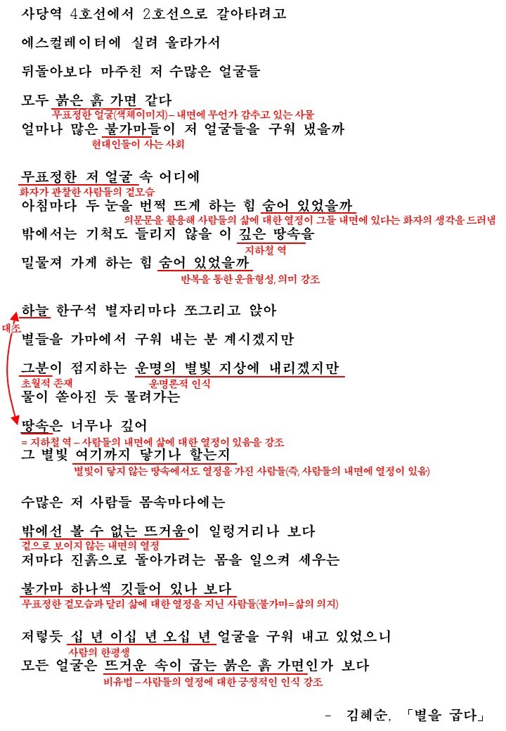 이 시에서 화자는 가면을 쓰고 있는 것 같은 사람들을 보며 처음에는 무표정하다고 느끼지만 이내 그 가면 속에 숨겨진 내면의 에너지를 찾아냅니다. 무표정한 저 얼굴 속에 아침마다 일어나서 일을 하러 나가는 내면의 힘이 있다고 생각하는 곳이죠. 이는 초월적 존재가 주는 것이 아니라 사람들 내부에 있는 것으로 화자는 초월적 존재가 있음을 알지만 그 초월적 존재가 주는 별빛마저도 들어오기 힘들것 같은 땅속(지하철역)에서도 분주히 움직이는 사람들을 보며 겉으로 드러나지 않은 내면의 뜨거움이 있다고 생각하게 됩니다.
